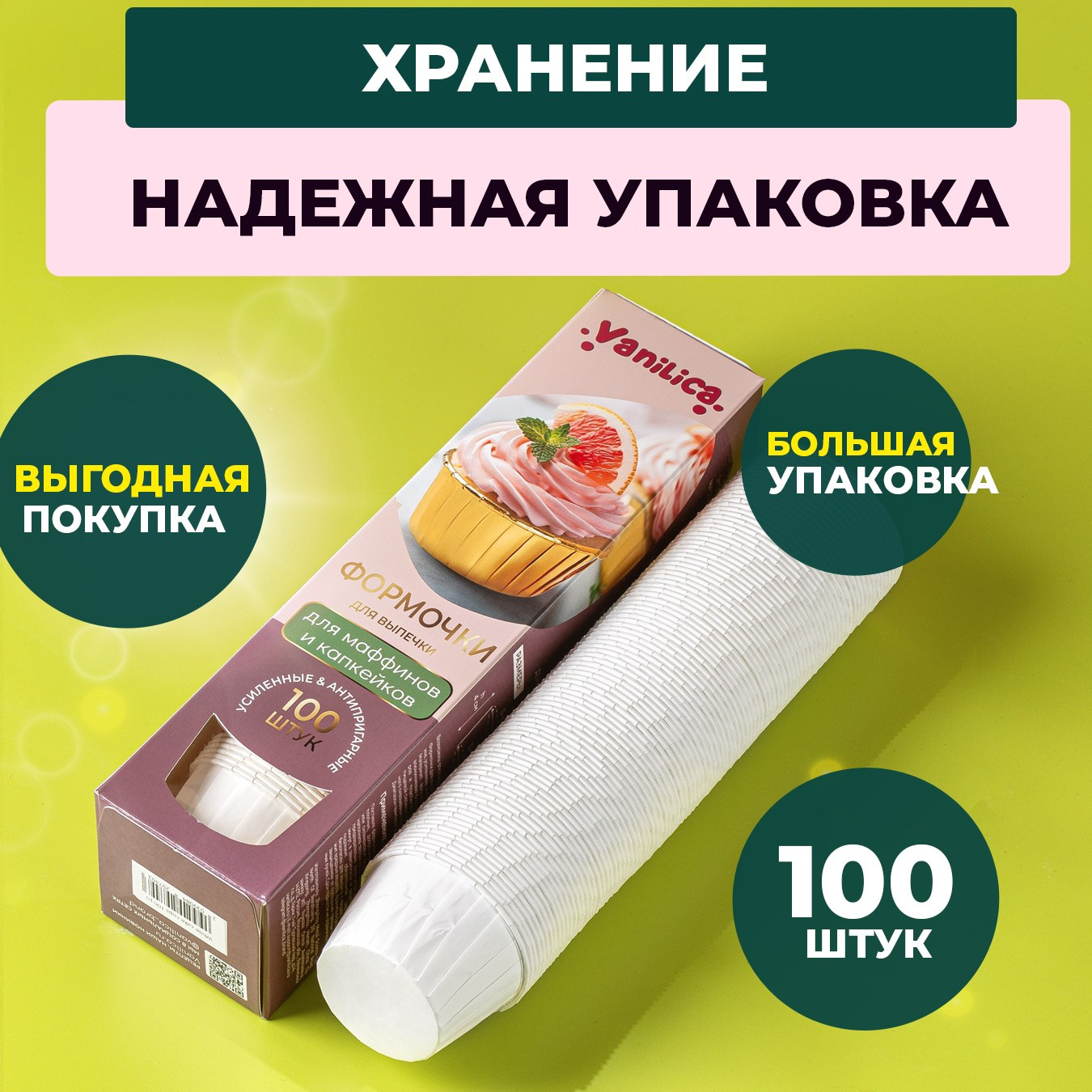 Набор форм для выпечки кексов, капкейков и маффинов. Одноразовые формочки из натурального пергамента удобны в использовании, их не нужно смазывать маслом, капсулы выдерживают температурный режим до +220 С. В наборе 100 шт капсул белого цвета.