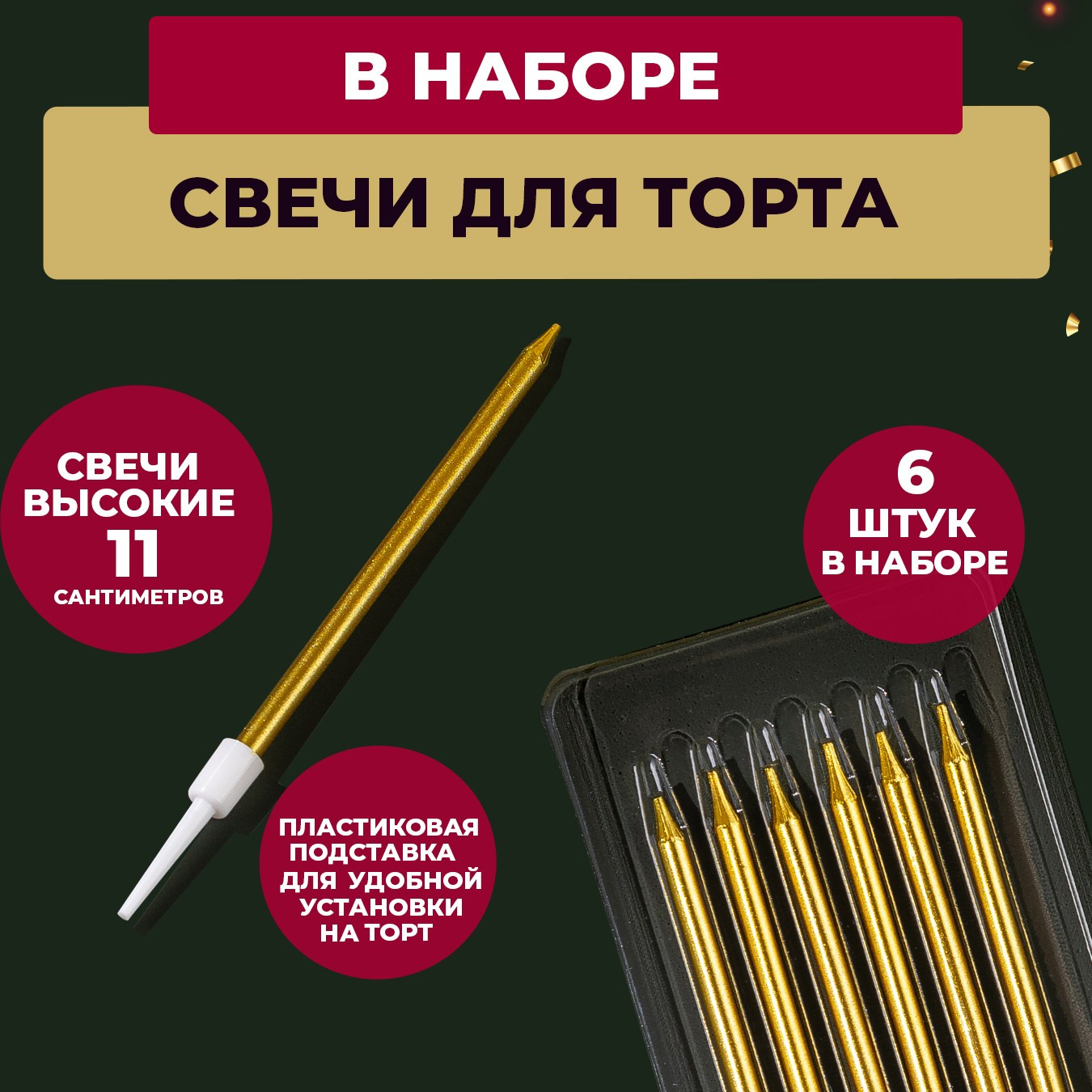 Набор включает в себя акриловый зеркальный топпер с надписью «Happy Birthday» для торта и 6 высоких свечей. Выполнен в золотом цвете.