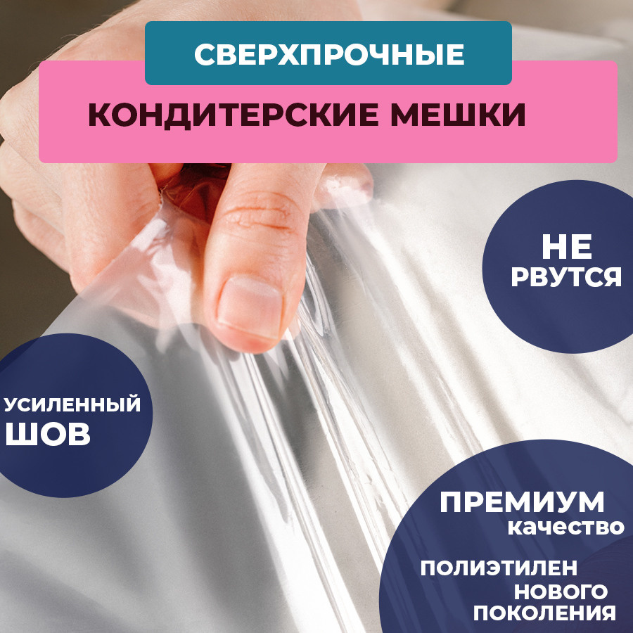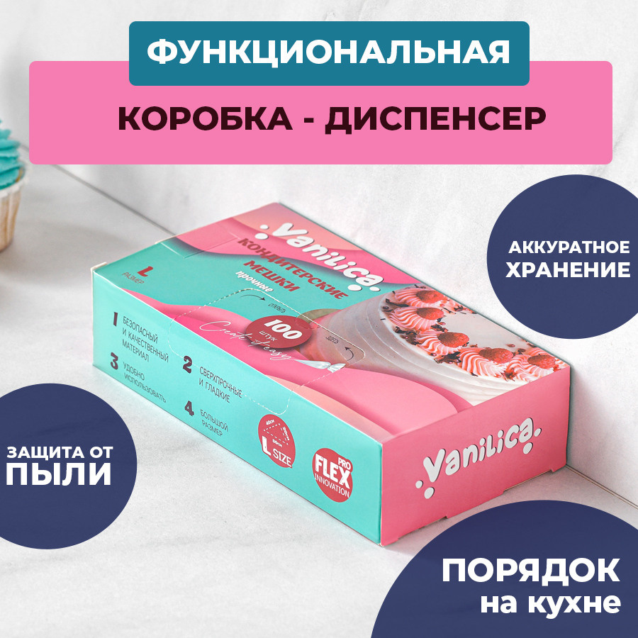 Кондитерские мешки Vanilica одни из самых прочных и надежных на рынке. Премиум полиэтилен разработан по специальной технологий Flex Pro Innovation. Благодаря супер эластичности и мега прочным швам кондитерские пакеты никогда Вас не подведут и справятся с любой работой в отличие от простых шуршащих пакетов. Мешки поставляются в коробке-диспенсере, пакеты удобно вытаскивать один за другим.