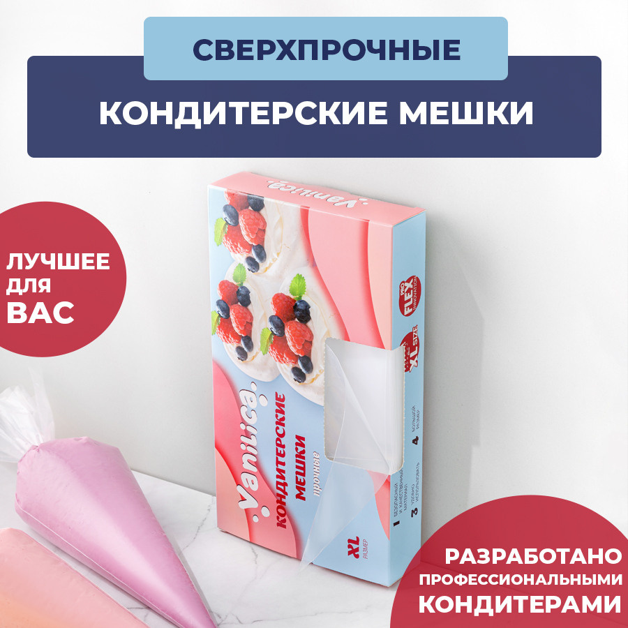 Кондитерские мешки Vanilica одни из самых прочных и надежных на рынке. Премиум полиэтилен разработан по специальной технологий Flex Pro Innovation. Благодаря супер эластичности и мега прочным швам кондитерские пакеты никогда Вас не подведут и справятся с любой работой в отличие от простых шуршащих пакетов. Мешки поставляются в коробке-диспенсере, пакеты удобно вытаскивать один за другим.