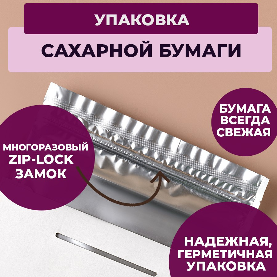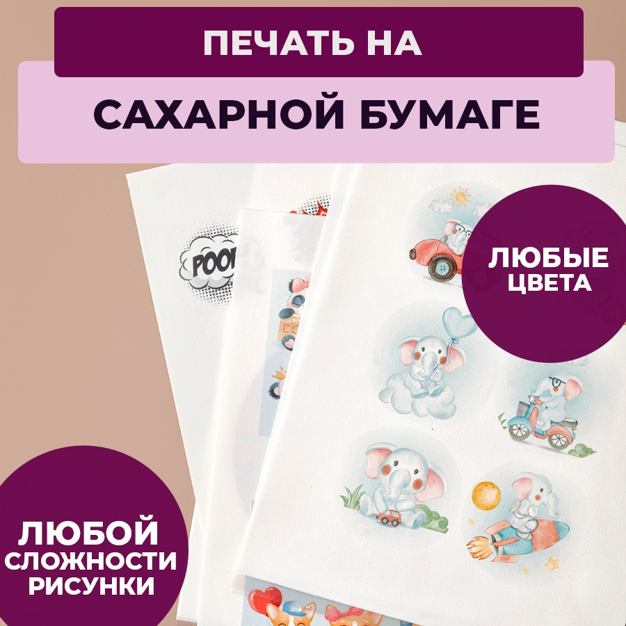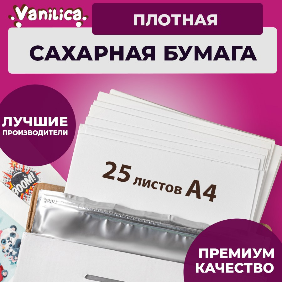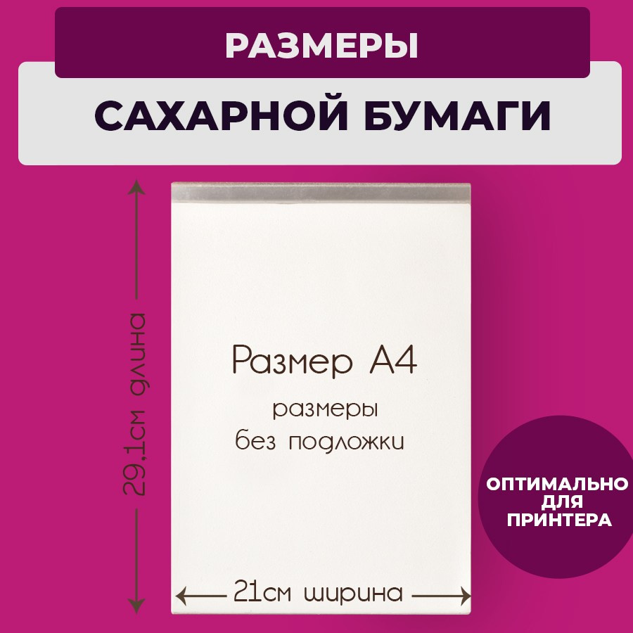 Сахарная съедобная кондитерская для печати на пищевом принтере (съедобная печать). В упаковке 25 шт, размера А4. Печатайте любые картинки. Кондитерская бумага гибкая, неприхотливая, не требует дополнительного покрытия декор гелем. Съедобная печать отлично взаимодействует с таким декором на торт как: марципан, мастика, масляный (не сильно влажный) белковый крем, шоколад, ганаш, глазурь, изомальт, карамель, замороженный торт.