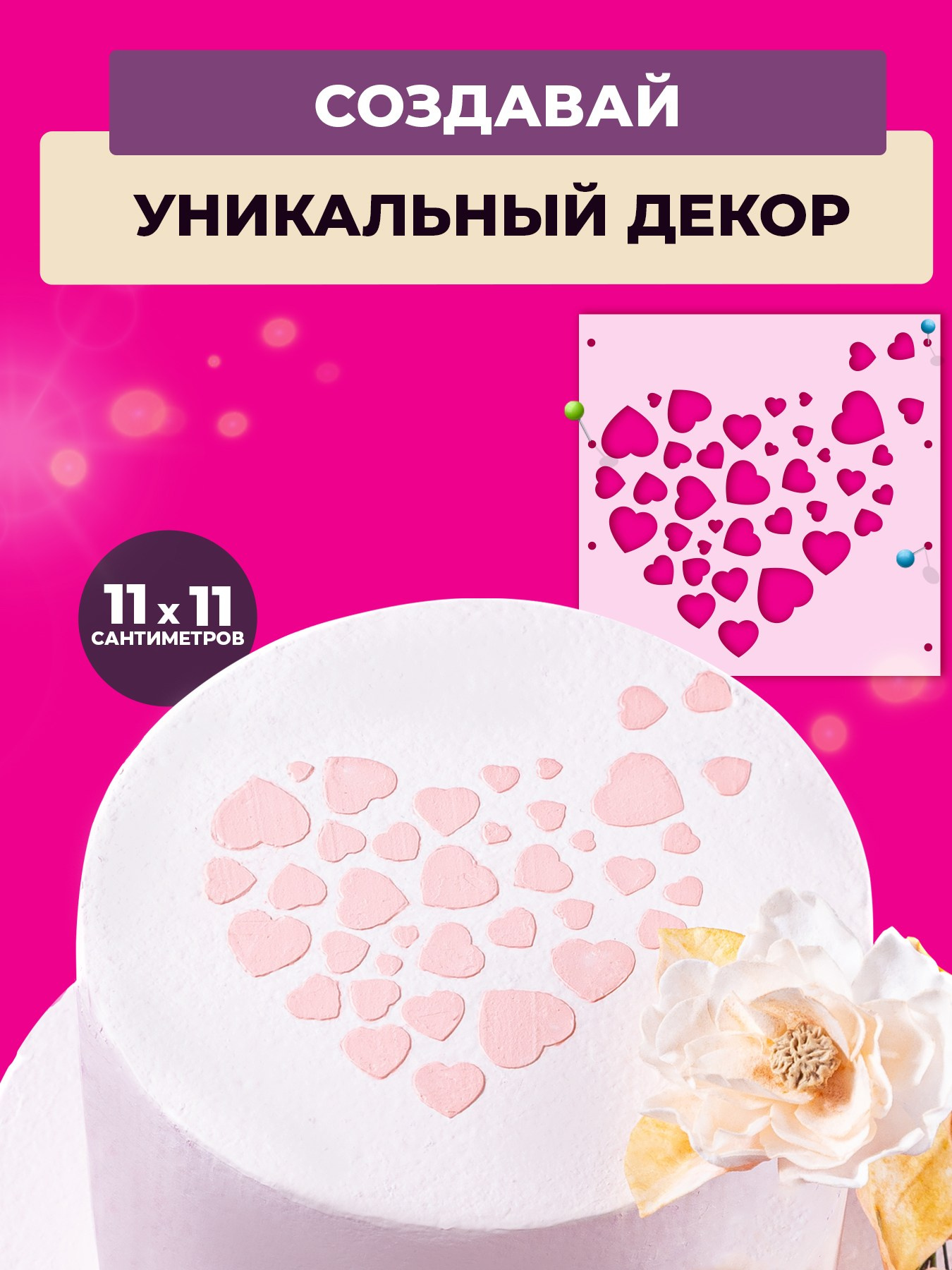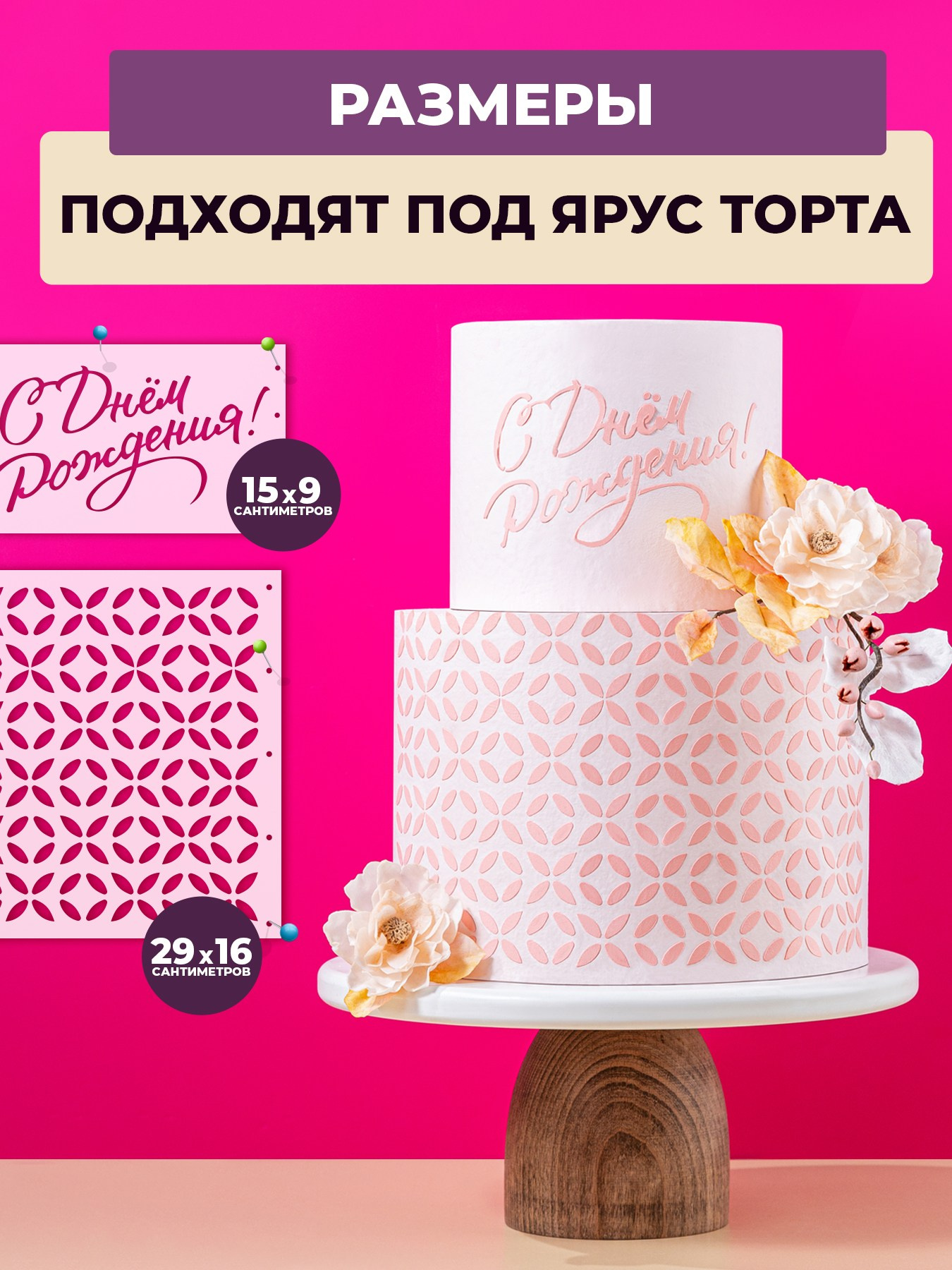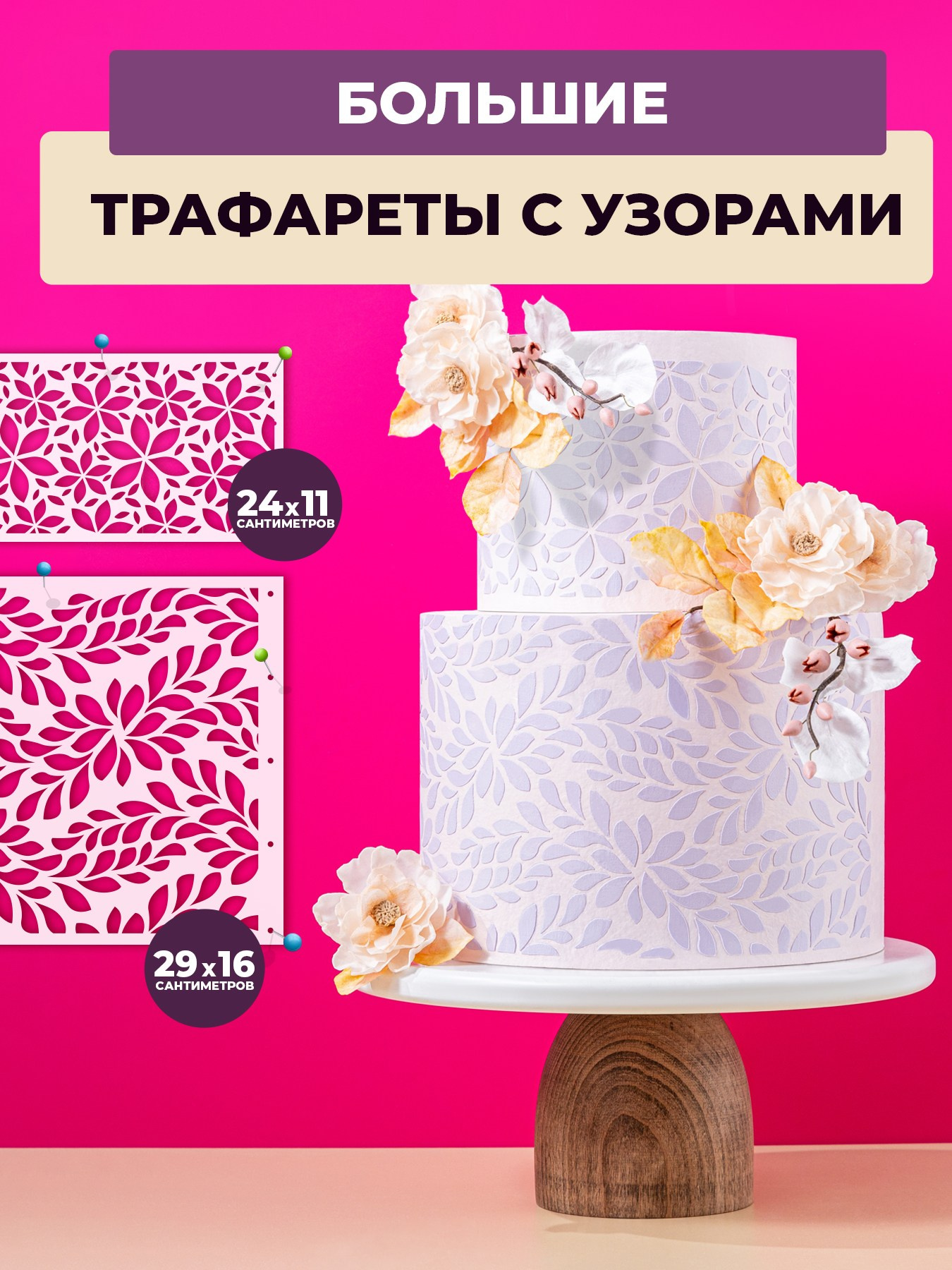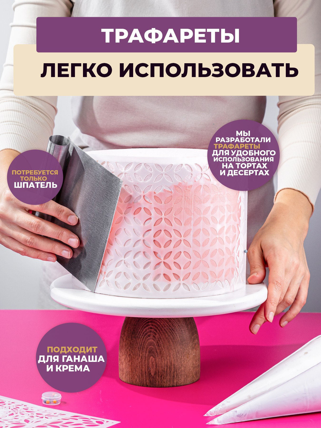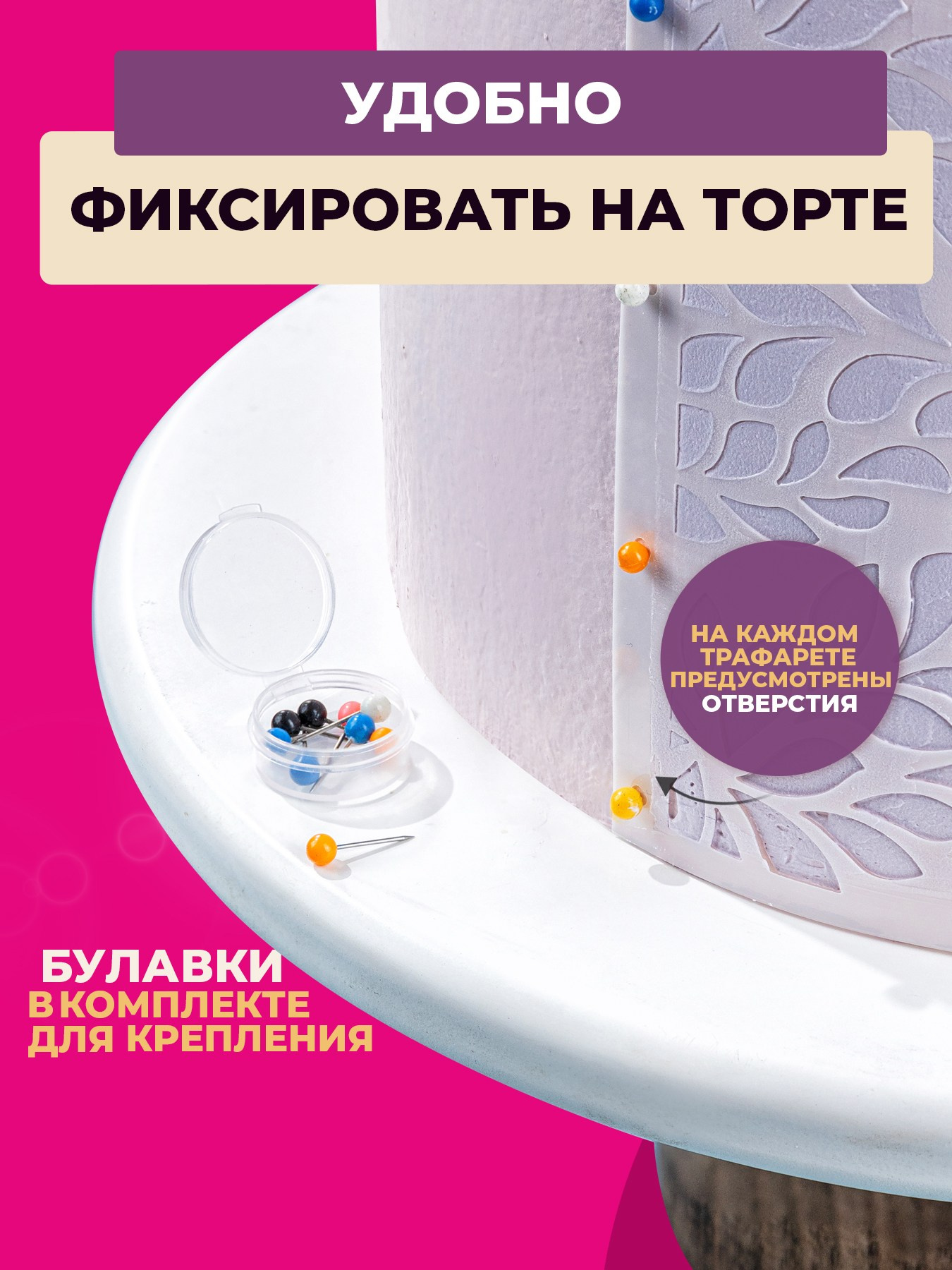 В комплекте 5 трафаретов разных размеров и рисунков, булавки для фиксации на торте.