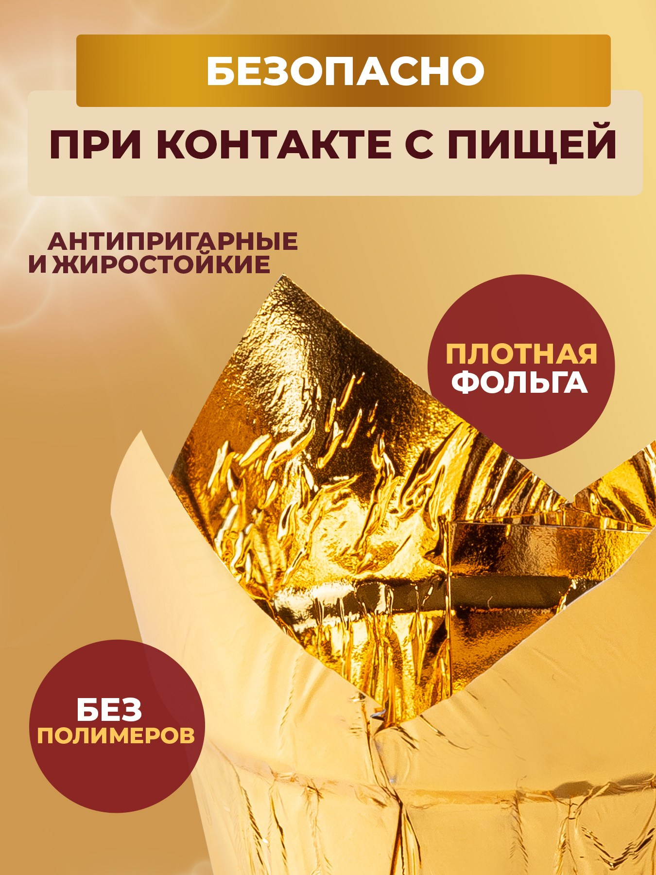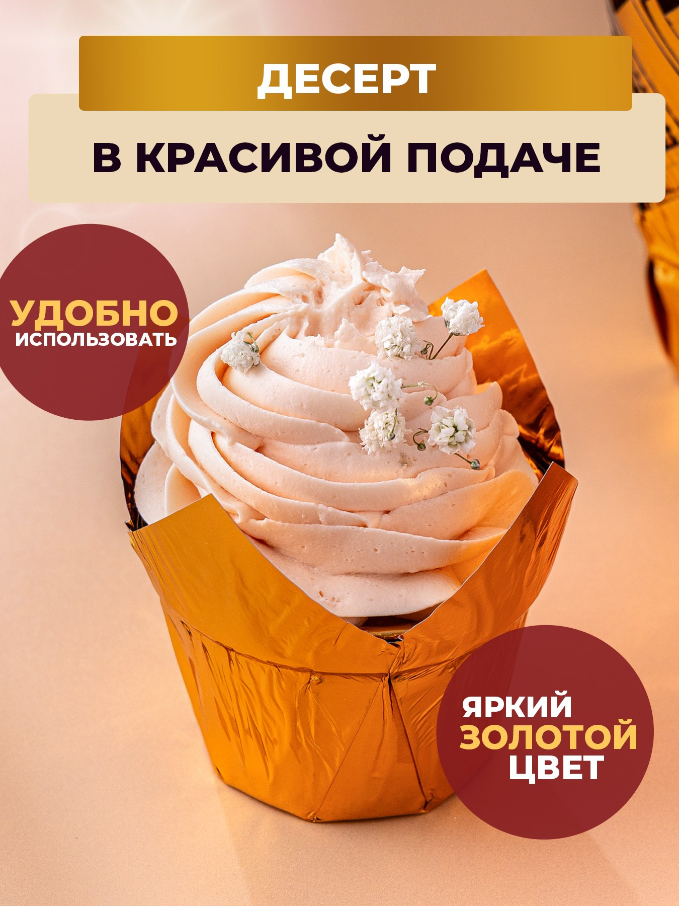 Набор форм для выпечки и декорирования кексов, капкейков и маффинов. Одноразовые формочки из алюминиевой фольги удобны в использовании, их не нужно смазывать маслом, выдерживают температурный режим до +200 С. В наборе 100 шт капсул золотого цвета.